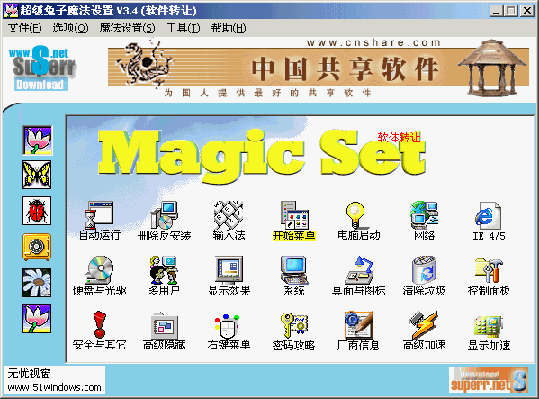 下面用这个超级兔仔来优化一下你的系统!(与其说优化,不如说使系统更顺手)ms2000是win2000用,ms98是win98用!点击相击的图标来下载