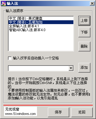 这个输入法设置对话框,是删除和排列输入法的,想不想用CTRL+空格键就打开你常用的输入法?那就删除不必要的输入法,把自己常用的输入法上移到英文输入法之后(最好不要排在英文之前,为什么?你自己试试:)
