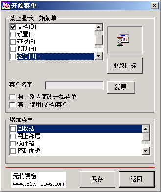 开始菜单大家都是天天用吧。这个功能可以隐藏开始菜单的项目或更改菜单的图标!在win98里,我就会把收藏夹和我的文档两个项目隐藏。
