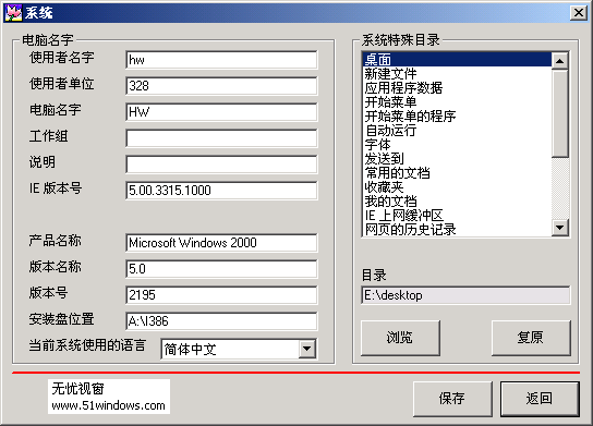 系统:这里用的最好多的就是改变系统特殊目录,像常用的桌面,IE上网缓冲区,可以改到非系统盘位置,由于我常把很多文件暂时放到桌面上。在一个就是改一下安装盘位置(这是2000里的画面),在win98里如果是用光盘安装的系统,当然要添加windows程序时,会让我们放入win98安装盘,这样太不方面,最好的方法就是把win98安装文件夹拷贝的硬盘,把安装目录改到这个目录!以后就不会提示插入光盘了!